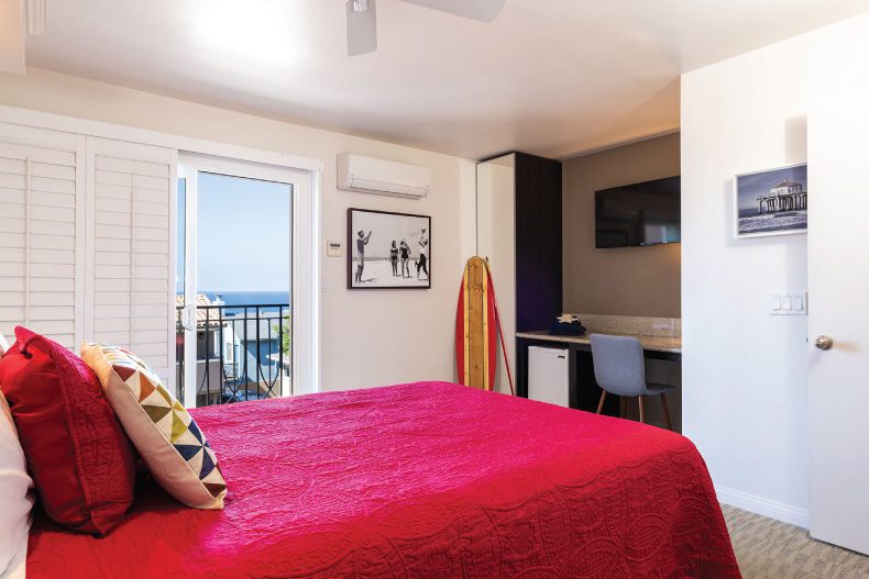 Adorable hotel on the main road in Manhattan Beach, Sits atop a steep paved walkway to the sands below. Beautiful homes line the way to the beach. Shoppes and restaurants abound within walking distance. Rooms are small, but not crowded for 4 people with 2 Comfy beds- Clean and brightly appointed. Microwave and mini-fridge are hidden in the closet to conserve space. 2 small chairs to sit, and a coffee maker with fixings atop a desk. The 2nd-floor ocean view was great! Eddie was very friendly and accommodating at check-in!